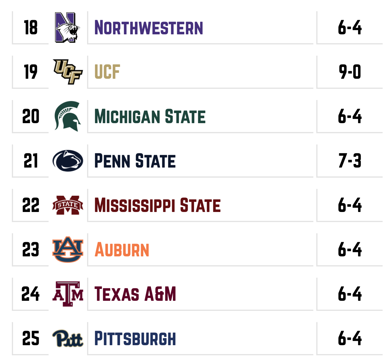 Is Iowa State (6-3, #18) a bad team? No. The win over West Virginia is great, but the Oklahoma State win, which looked good at the time, doesn’t mean as much as they’ve fallen to 5-5 on the year. The Cyclones also have losses to 4-6 TCU and 6-4 Iowa. Not to mention their season opener was cancelled because of a hurricane. That’s out of their hands, and they’d likely have won that game, but apparently we’re punishing teams for cancelled games now. Cincinnati has three more wins and two fewer losses than Iowa State and I think UC should be ranked ahead of them.