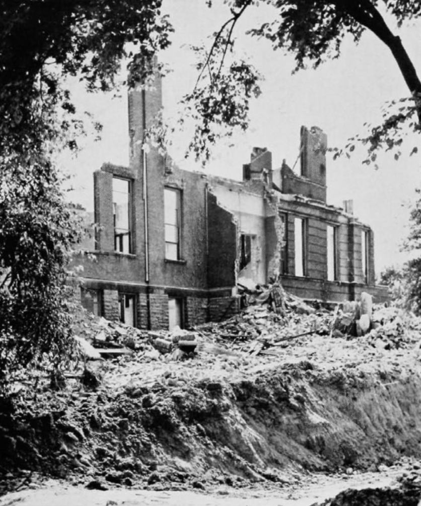 "True, the brickwork is still in fine condition, but otherwise there are only the doors that are in fair condition. Floors, walls and foundation are crumbling; the window frames are decayed from heavy rains and snows. Plumbing very bad, that is the old plumbing. Steps leading to first floor of McMicken Hall in poor shape. The lions may weather a few more years, say 10 or 15 years more or less."
